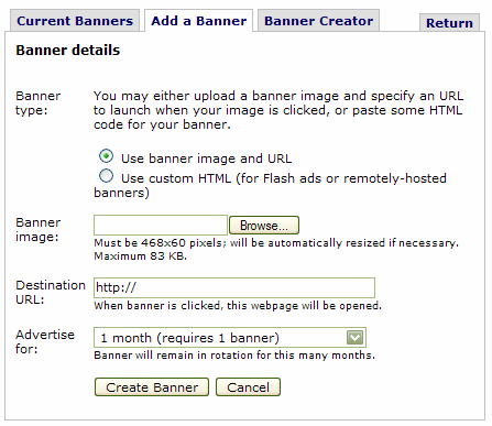 First select whether you will be choosing to upload your own banner image (gif, jpg or bng file) or whether you wish to instead use a flash banner or remotely hosted banner and will instead be entering the proper HML to call the image/file from another Internet location.